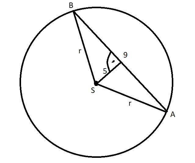 W tym zadaniu podaj, ile wynoszą promień, pole i obwód koła, o którym wiadomo, że ma cięciwę równą 9 cm, która zawiera się w prostej znajdującej się w odległości 5 cm od środka koła.