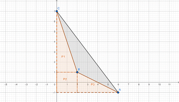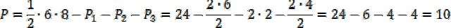 Aby policzyć pole trójkąta ABC obliczymy pole całego trójkąta złożonego z wszystkich figur i odejmiemy pola figur zaznaczonych na czerwono: