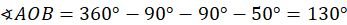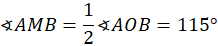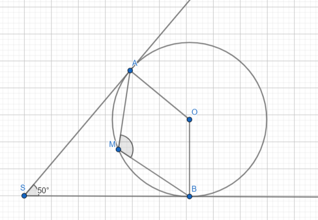 Dorysuj promienie styczne do kąta tak, aby otrzymać czworokąt AOBS. Policz miarę kąta wypukłego AOB. Zauważ, że kąt AMB jest równy połowie kąta wklęsłego środkowego AOB, bo jest kątem wpisanym opartym na tym samym łuku.
