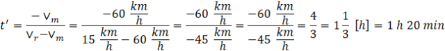 Zauważ, że skoro motocyklista dogoni rowerzystę, to po pewnym czasie przebyte przez nich drogi będą takie same. Przyrównaj je do siebie i oblicz szukany czas, po jakim to nastąpi (t’), wiedząc, że motocyklista poruszał się 1 godzinę krócej, czyli (1 – t’).