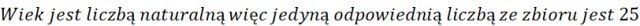 . Wiek osoby jest liczbą należącą do przedziału (24, 26). Jedyną liczbą całkowitą w tym przedziale jest liczba 25.