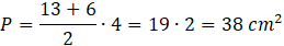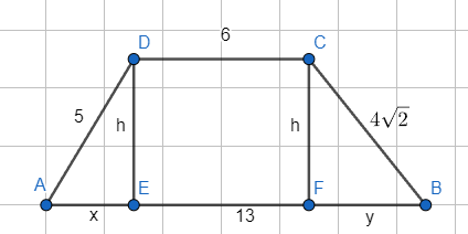 Poprowadź wysokości z wierzchołków górnej podstawy i oznacz nowo powstałe boki przez x i y. Następnie określ y przez x i wykorzystaj dwukrotnie twierdzenie Pitagorasa, skąd wyliczysz x. Na koniec oblicz wysokość z twierdzenia Pitagorasa i pole trapezu.