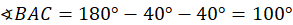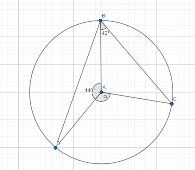 Zauważ, że trójkąt ABC jest równoramienny, więc kąty przy jego podstawie są równe. Korzystając z sumy kątów w trójkącie oblicz miarę kąta BAC. Aby obliczyć miarę kąta α, skorzystaj z tego, że tworzy on kąt pełny z kątami DAB i BAC.