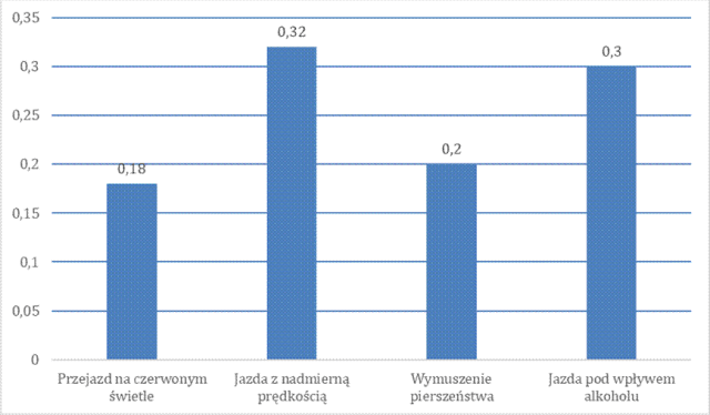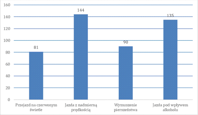 Dane przedstawione w tabeli przedstaw w postaci diagramu kolumnowego i diagramu częstości względnych, jeśli w pewnym mieście komendant policji przeanalizował liczbę wypadków drogowych z ostatniego roku, spowodowanych przez kierowców samochodów osobowych na terenie tego miasta. Badaną cechą była przyczyna wypadku.