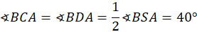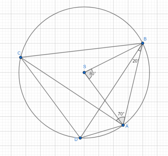 Policz miary kątów przy podstawie trójkąta równoramiennego ABS. Skorzystaj z twierdzenia o kącie wpisanym i środkowym opartych na tych samych łukach i o dwóch kątach spisanych opartych na tych samych łukach. Wypisz te zależności. Zsumuj odpowiednie kąty, aby otrzymać miary kątów czworokąta ABCD.