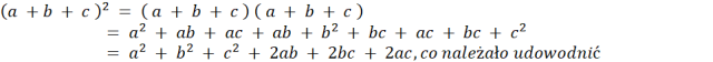 W pierwszym kroku należy przekształcić kwadrat sumy, aby udowodnić prawdziwość podanego wyrażenia, a następnie w analogiczny sposób utworzyć podobne wyrażenia tak, jak przedstawiono w rozwiązaniu.