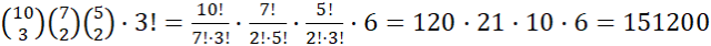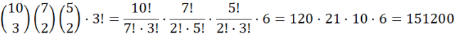 Masz do wykorzystania dziesięć liter, przy czym litera A występuje trzykrotnie, a litera M i T dwukrotnie. Tworzysz więc 10-elementowy ciąg liter. W pierwszej kolejności losujesz trzy miejsca z dziesięciu dostępnych dla liter A. Następnie losujesz dwa miejsca z siedmiu pozostałych dla liter M, a następnie dwa miejsca z pięciu pozostałych dla liter T. Pozostałe litery możesz umieścić na 3! sposoby. Łącznie możesz więc utworzyć