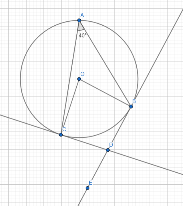 Na okręgu zaznaczono cięciwy AB i AC, które przecinają się pod kątem 40°. Poprowadzono styczne do okręgu w punktach B i C. Wyznacz miarę kąta ostrego między tymi stycznymi.