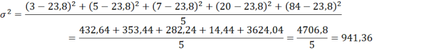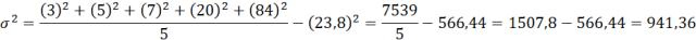 Mając dany zestaw liczb: 3 5 7 20 84, określ jego wariancję, wykorzystując dwa sposoby.