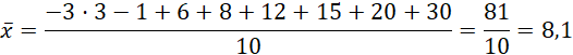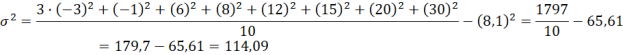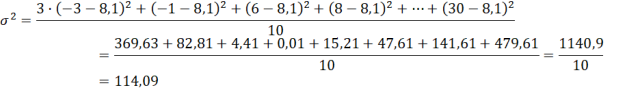 Mając dany zestaw liczb: -3 -3 -3 -1 6 8 12 15 20 30, określ jego wariancję, wykorzystując dwa sposoby.