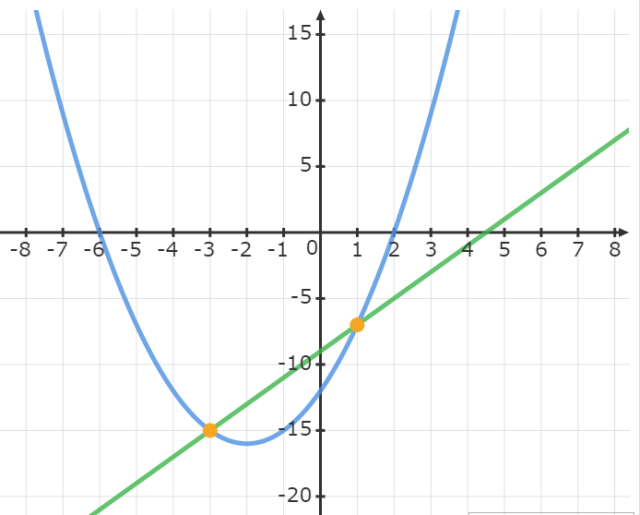 Odp. Punkty wspólne to (-3, -15) oraz (1, -7).