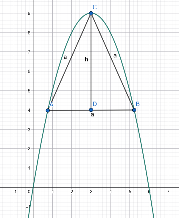 Zilustruj opisaną sytuację rysunkiem w układzie współrzędnych i wyznacz współrzędne wierzchołków tego trójkąta, jeśli wierzchołki trójkąta równobocznego ABC są punktami paraboli . Punkt C jest wierzchołkiem paraboli, a bok AB trójkąta jest równoległy do osi .