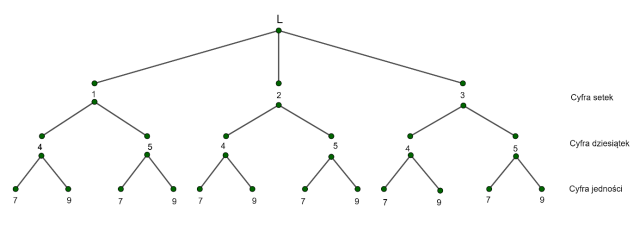Narysuj graf, który przedstawia podane zależności: Liczby dzielą się najpierw na 3 grupy w zależności od cyfry setek, 2 grupy w zależności od cyfry dziesiątek, a później każda z nich dzieli się na 2 grupy w zależności od cyfry jedności.