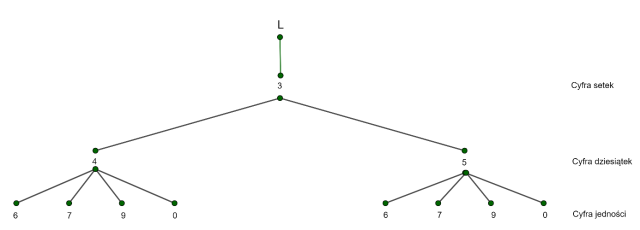 Narysuj graf, który przedstawia podane zależności: Liczby dzielą się najpierw na 1 grupą w zależności od cyfry setek, 2 grupy w zależności od cyfry dziesiątek, a później każda z nich dzieli się na 5 grup w zależności od cyfry jedności.