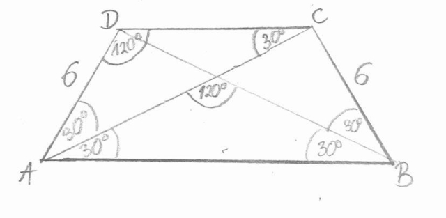 W tym zadaniu wyznacz, ile wynosi pole trapezu równoramiennego, którego ramiona są równe 6 cm, a przekątne przecinają się pod kątem 120° i są dwusiecznymi kątów przy podstawie.