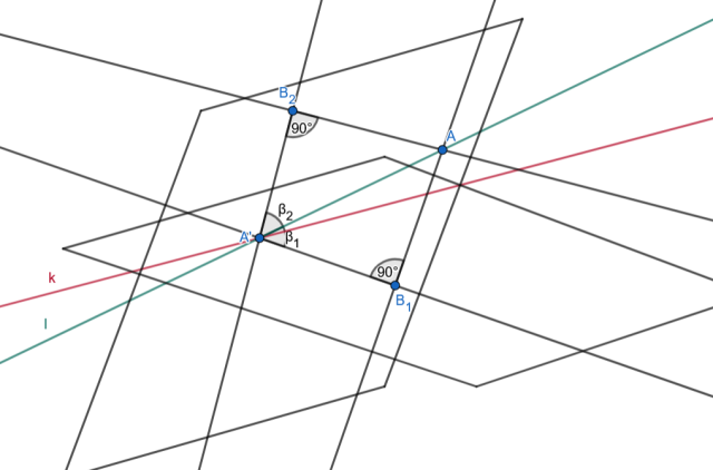 Uzupełnij tabelkę, jeśli półpłaszczyzny i o wspólnej krawędzi tworzą kąt dwuścienny o mierze . Przez punkt A należący do tego kąta poprowadzono prostą prostopadłą do prostej i przecinającą ją w punkcie A’. Punkt jest rzutem prostokątnym punktu A na płaszczyznę . Prosta jest nachylona do płaszczyzny pod kątem , a do płaszczyny pod kątem .