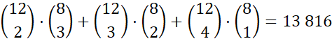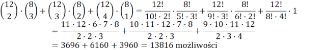 Wybierasz pięcioosobową delegację z grupy 20 osób, w której jest 12 kobiet. Ile jest możliwości takiej delegacji, jeżeli są w niej co najmniej dwie i maksymalnie cztery kobiety?