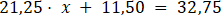 Przenoś kolejno wyrażenia na drugą stronę tak, aby po jednej została sama niewiadoma, a po drugiej liczby. Odejmij od obu stron 11,5, a potem podziel na 21,25.