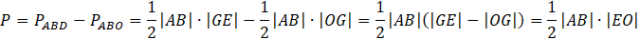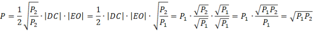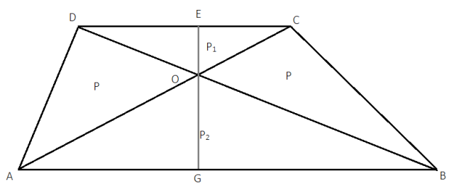 Trójkąty ABO i DCO są podobne na mocy cechy kąt – kąt – kąt (jedna para kątów wewnętrznych jest wierzchołkowa, a dwie są kątami odpowiadającymi). Wyznacz skalę podobieństwa trójkątów jako pierwiastek skali podobieństwa pól. Zapisz pole trójkąta AOD (oznaczone jako P) jako różnicę pól trójkątów ABD i ABO. Zauważ, że trójkąty mają równe podstawy, więc wyrażenie