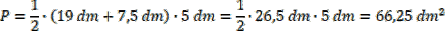 Podziel figurę na trapez i prostokąt. Zauważ, że dolna podstawa trapezu jest równa dłuższemu boku prostokąta. Oblicz pola figur wykorzystując wzór na pole trapezu