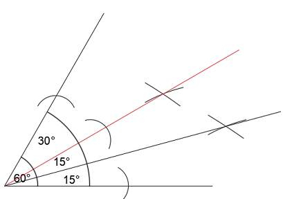 Ponownie narysuj dwusieczną kąta, dzieląc kąt 30° na dwa po 15°.