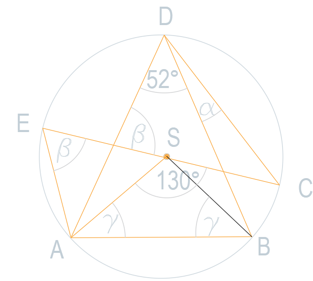 Podaj miary kątów wskazanych literami. S jest środkiem okręgu.