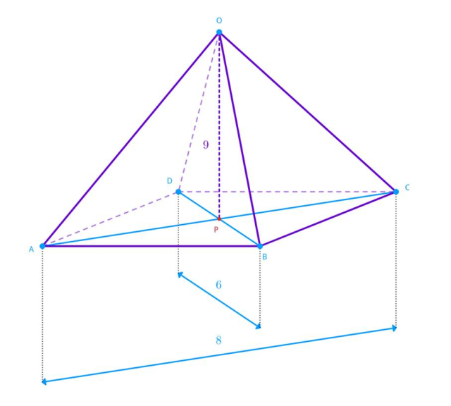 Na rombie o przekątnych długości 8 i 6 cm zbudowano ostrosłup o wysokości 9 cm. Wiedząc, że ściany boczne powstałej bryły są nachylone pod tym samym kątem do płaszczyzny podstawy, oblicz długości krawędzi ściany bocznej ostrosłupa.