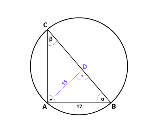 W trójkącie prostokątnym najkrótsza wysokość jest równa 15, a najkrótszy bok ma długość 17. W tym zadaniu musisz obliczyć promień okręgu opisanego na tym trójkącie.