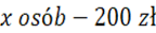 Jako x należy oznaczyć liczbę osób, gdy koszt przejazdu wynosi 200 zł. Wiedząc, że 15 osób zapłaciło 78 zł, po ułożeniu proporcji, i wykonaniu mnożenia „na krzyż” oraz przekształceń równania otrzymamy x. Należy pamiętać, że x to liczba osób więc wynik musi być liczbą naturalną z przybliżeniem w dół.