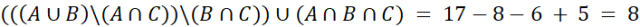 Widać na nim, że suma zbiorów A i B to 17 elementów. Następnie odejmujemy od niej elementy zbioru C, ale nie wszystkie elementy tego zbioru, ale te będące częścią wspólną z którymkolwiek ze zbiorów. Na diagramie widać, że będzie to działania 17 - 9 = 8