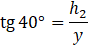 Długość y oraz szukana wysokość szerszej części lejka oznaczona jako h2 są przyprostokątnymi trójkąta prostokątnego o kącie 40°. Więc h2 możesz obliczyć z definicji funkcji trygonometrycznej, a dokładniej z definicji tangensa. Szukana wysokość leży naprzeciw tego kąta, więc możesz zapisać następującą równość:
