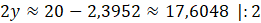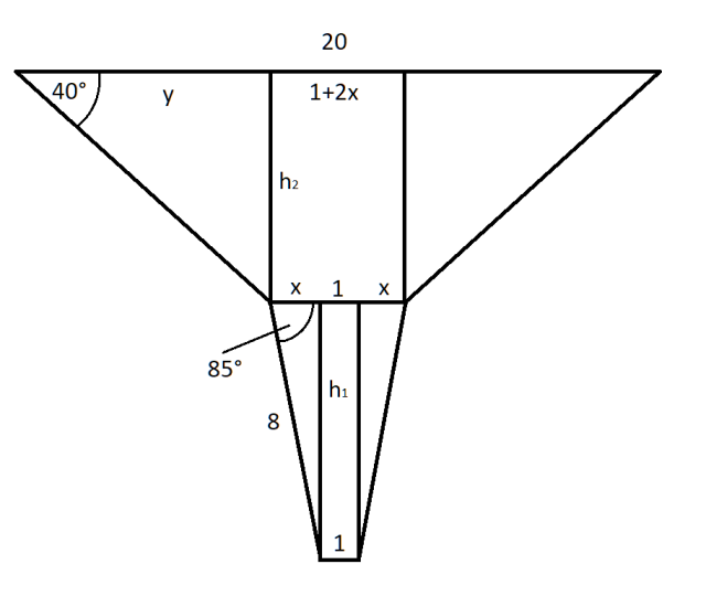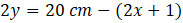 Aby obliczyć długość oznaczoną jako y, od najszerszej szerokości lejka, czyli 20 cm musisz odjąć wcześniej obliczoną szerokość „trąbki” u jej początku. Otrzymasz wtedy podwójną długość y, więc otrzymany wynik musisz podzielić przez 2.