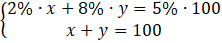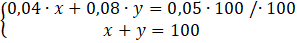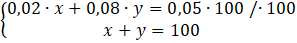 W tym zadaniu musisz wybrać roztwór 8-procentowy i najpierw roztwór 2-procentwoy, a następnie 4-procentowy. Na początku rozwiązywania danego przypadku musisz oznaczyć symbolami masy obu roztworów. Następnie musisz zapisać pierwsze równanie, w którym suma ilości cukru w poszczególnych roztworach jest równa jego ilości w 100 g 5-procentowego roztworu. Drugim równaniem będzie to, że suma mas obu roztworów jest równa 100.
