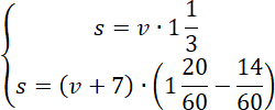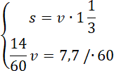 Drugie równanie układu powstało dzięki informacji: we wtorek jadąc z prędkością o 7 km/h większą chłopiec pokonał ten sam dystans w czasie o 14 minut krótszym.
