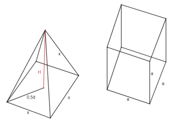 Zacznij od obliczenia połowy długości przekątnej podstawy ostrosłupa. Skorzystaj z twierdzenia Pitagorasa, aby obliczyć długość wysokości w ostrosłupie. Następnie oblicz sumę długości krawędzi w obu bryłach i przyrównaj do siebie wyniki i wyznacz zależność x od a. Kolejno przyrównaj wysokości w obu bryłach.