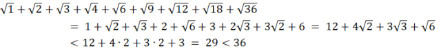 Wykaż, że suma pierwiastków wszystkich dzielników liczby 36 jest mniejsza niż 36.