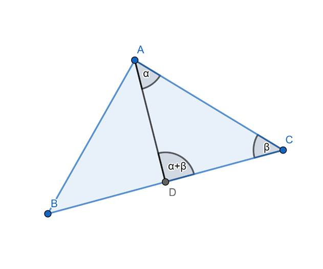 W trójkącie ABC poprowadzono środkową AD. W tym zadaniu musisz wykazać, że jeśli suma miar kątów DAC i ACB jest równa mierze kąta ADC, to trójkąt ABC jest równoramienny.