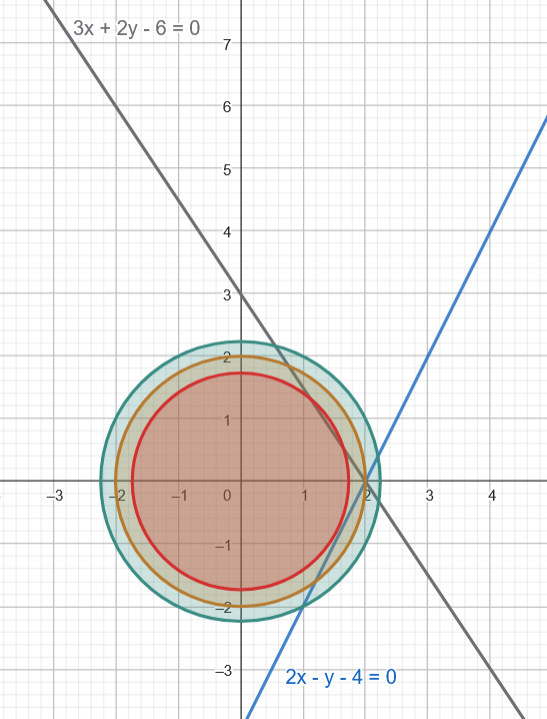 Skorzystaj z tego, że równanie okręgu można opisać za pomocą wzoru: , gdzie to środek okręgu, a to jego promień i na tej podstawie narysuj je w jednym układzie współrzędnych z podanymi prostymi.