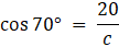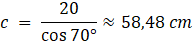 Dany jest trójkąt prostokątny o kącie ostrym 70° i najkrótszym boku długości 20 cm, znajdź długość jego przeciwprostokątnej.