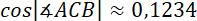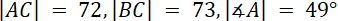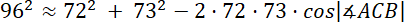 Narysuj rysunek pomocniczy. Oblicz długość boku AB korzystając z twierdzenia cosinusów. Następnie skorzystaj ponownie z tego twierdzenia i wyznacz miarę kąta ACB. Z własności sumy kątów w trójkącie wyznacz miarę ostatniego kąta tego trójkąta.