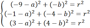 Znajdź równanie okręgu opisanego na trójkącie ABC. A(-9,0), B(-1,-4), C(3,4).