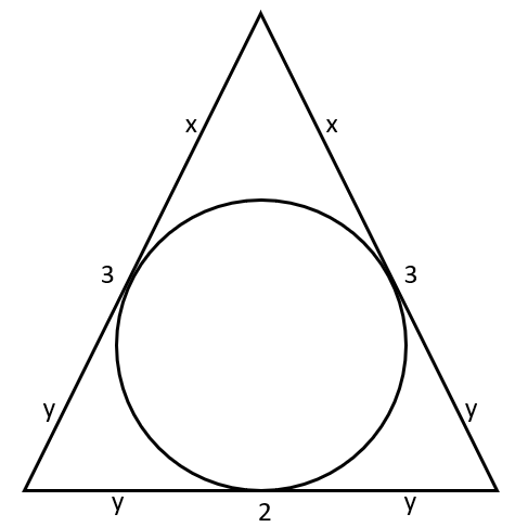 Ponieważ trójkąt jest równoramienny, punkt styczności dzieli podstawę na dwa odcinki o równych długościach. Równości pozostałych odcinków wynikają bezpośrednio z twierdzenia o odcinkach stycznych. Ułóż równania opisujące długości boków w zależności od odcinków x i y, których rozwiązania są szukanymi długościami.