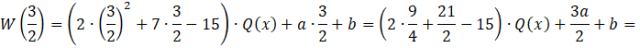 W rozwiązaniu zadania skorzystaj z twierdzenia o rozkładzie wielomianu, z którego wynika, że wielomian W(x) można zapisać w postaci W(x) = Q(x)P(x) + R(x), gdzie R(x) jest resztą z dzielenia wielomianu W(x) przez P(x) (w przypadku tego zadania P(x) jest wielomianem stopnia drugiego, więc reszta może być stopnia co najwyżej pierwszego). Ponieważ wiesz, że wielomian jest podzielny przez 2x – 3, musi mieć taki sam pierwiastek jak pierwiastek dwumianu – a więc jego wartość dla x =