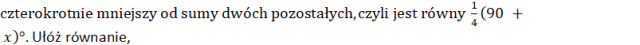 Niech x to będzie jednego zakątów. Miara drugiego kąta na podstawie treści to: