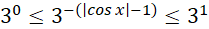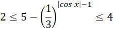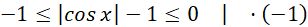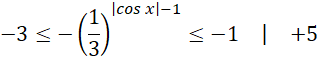 Nie ma wartości 𝑥, dla których jakaś operacja matematyczna w wyrażeniu była niewykonalna, więc dziedziną są liczby rzeczywiste. Żeby wyznaczyć zbiór wartości, przypomnij sobie, że cosinus przyjmuje wartości między -1 a 1 włącznie i działaj w sposób odwrotny niż normalnie – wyznacz wyrażenie z rozwiązania, przekształcając odpowiednio układ nierówności.