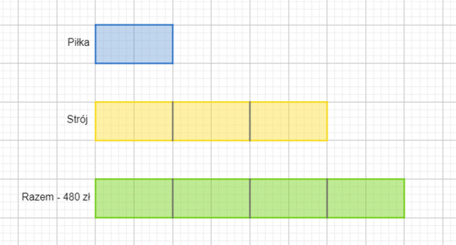 Zauważ, strój kosztuje 3 razy więcej od piłki, czyli zamiast stroju można by kupić 3 piłki, co razem z wcześniejszą piłką dawałoby 4 sztuki za 480 zł. Oznacza to, że 1 piłka jest warta 120 złotych, a strój – 3 razy więcej, czyli 360 zł.