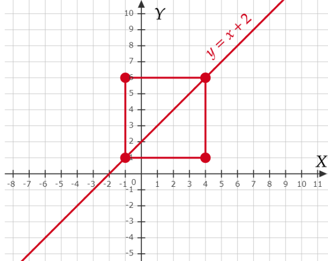 Na początek, narysuj podany kwadrat i prostą w układzie współrzędnych. Zauważ, że punkt przecięcia prostej podanej z tą, której szukasz ma być dla