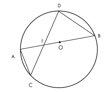 π cm². Cięciwa CD przecina średnicę AB w punkcie E, odległym o 5 cm od środka koła, a pole trójkąta EBD jest 9 razy większe od pola trójkąta ACE. W tym zadaniu musisz obliczyć odległość cięciwy CD od środka koła.