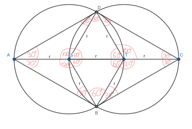 Narysuj poglądowy rysunek. Zauważ, że skoro wszystkie boki trójkąta SDT są promieniami okręgów to ten trójkąt jest równoboczny.