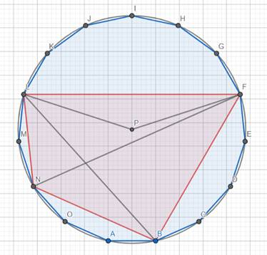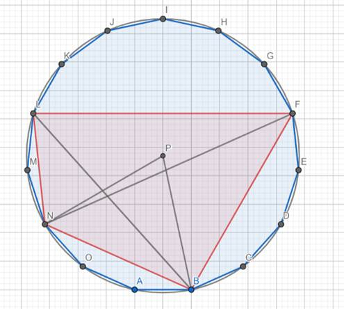 Narysuj okrąg opisany na piętnastokącie i zaznacz dwie wskazane przekątne. Policz miarę kąta środkowego w piętnastokącie foremnym i policz miary kątów NPB i LPF. Zauważ, że kąty opisane, czyli NLB i NFB oraz LBF i LNF są dwukrotnie mniejsze od kątów środkowych. Wyznacz miarę kąta ostrego między przekątnymi, korzystając z wyliczonych miar kątów NLB i LNF.